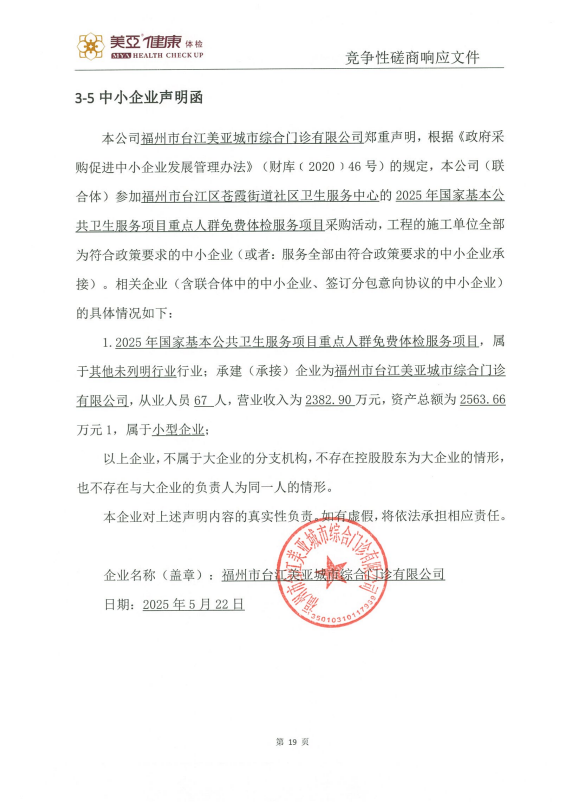 1 | 福州市台江美亚城市综合门诊有限公司 | 2025年国家基本公共卫生服务项目重点人群免费体检服务项目 | 福州市台江区苍霞街道社区卫生服务中心2025年国家基本公共卫生服务项目重点人群免费体检服务 | 2025年国家基本公共卫生服务项目重点人群免费体检服务项目,成交供应商必须在《医疗机构管理办法》、《医师法》、《护士法》等法规下进行体检活动,医疗操作过程必须严格执行无菌操作等规程,防止发生交叉感染。 | 自合同签订之日起365日。 | 2025年国家基本公共卫生服务项目重点人群免费体检服务项目,成交供应商必须在《医疗机构管理办法》、《医师法》、《护士法》等法规下进行体检活动,医疗操作过程必须严格执行无菌操作等规程,防止发生交叉感染。 |