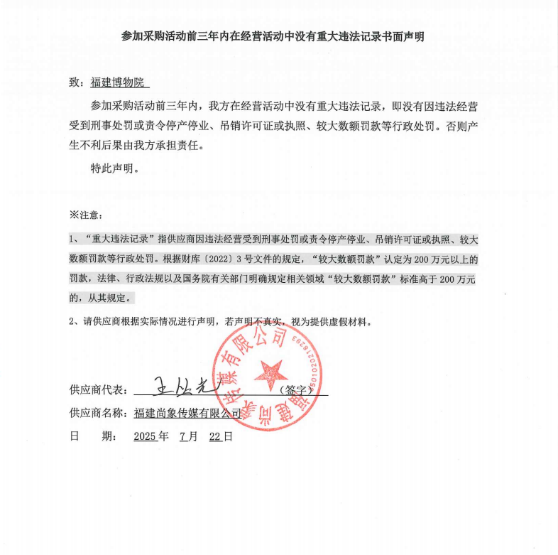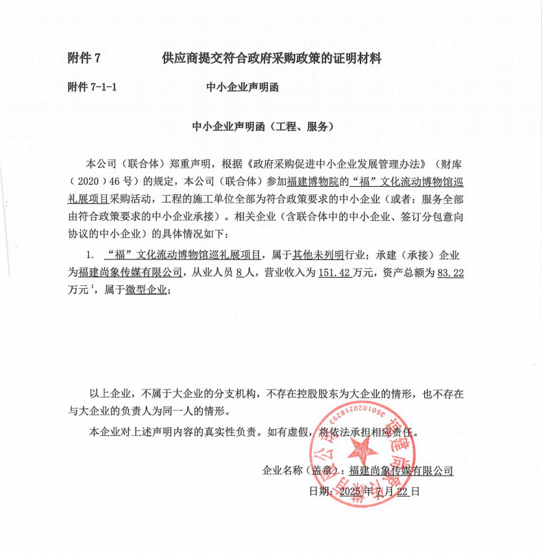 1 | 福建尚象传媒有限公司 | “福”文化流动博物馆巡礼展项目 | “福”文化流动博物馆巡礼展项目 | 完成“福”文化流动博物馆巡礼展项目 | 合同签订之日起至2026年3月31日。 | “福”文化流动博物馆巡礼展项目,具体见磋商文件。 |