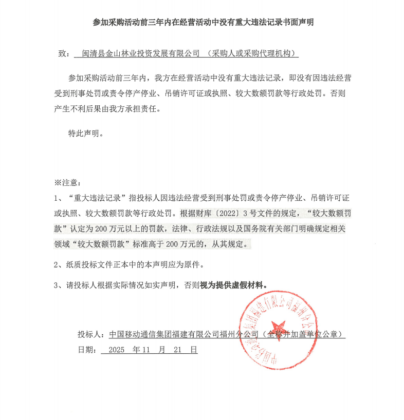 1 | 中国移动通信集团福建有限公司福州分公司 | 闽清县森林生态巡处监控系统项目 | 闽清县森林生态巡处监控系统项目 | 完成闽清县森林生态巡处监控系统项目 | 合同签订后(60)天内交付。 | 验收合格后交付使用 |