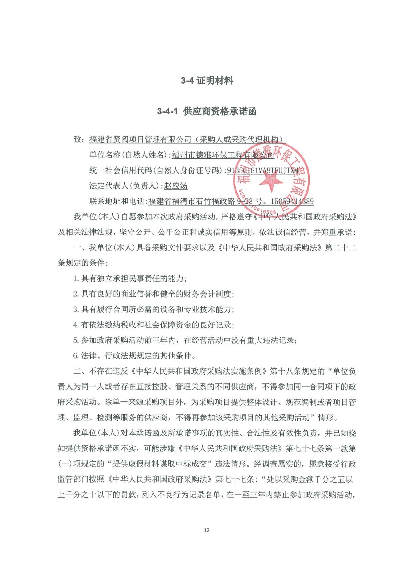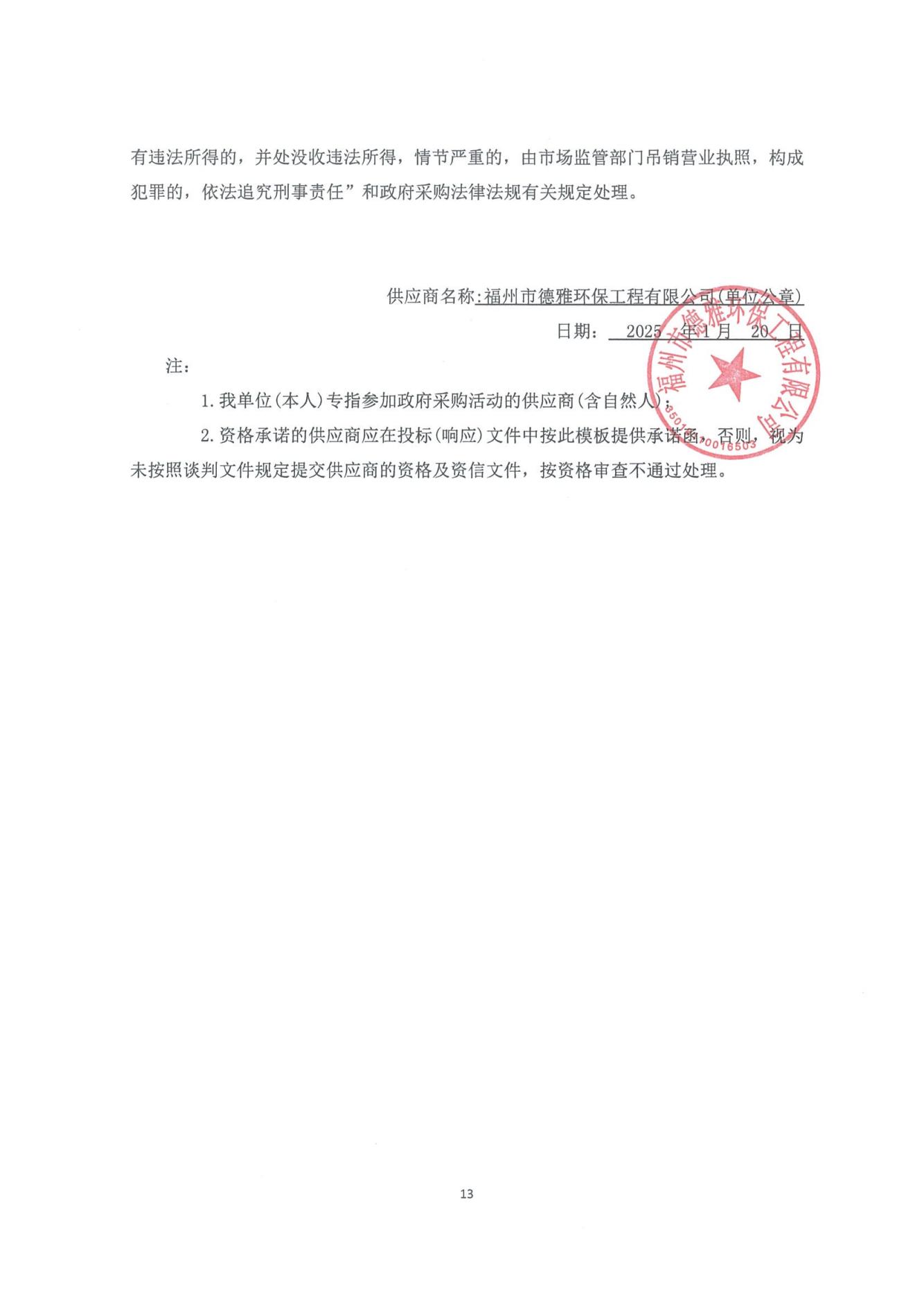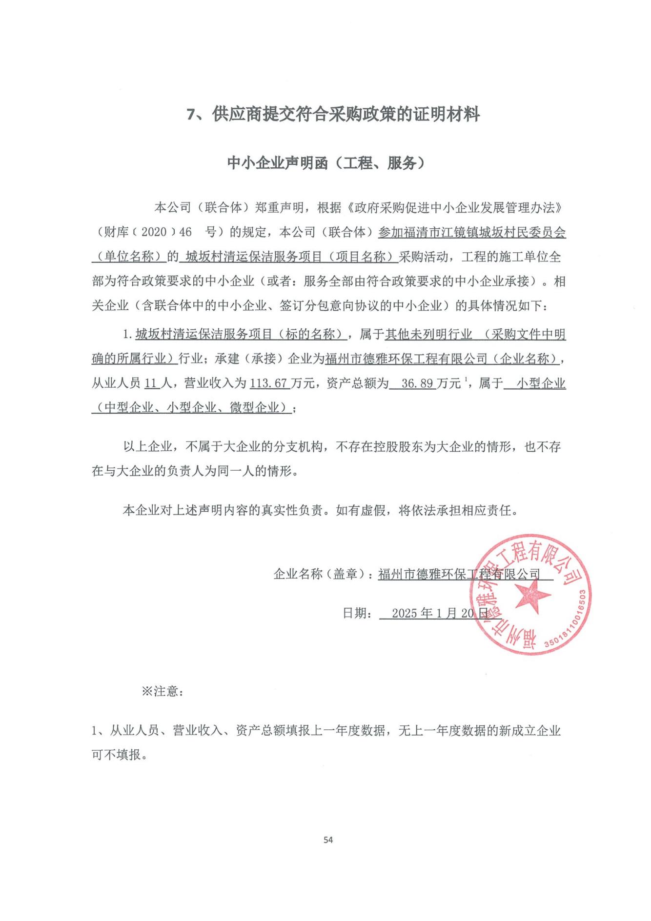 1 | 福州市德雅环保工程有限公司 | 城坂村清运保洁服务项目 | 城坂村清运保洁服务 | 完全响应竞争性谈判文件及国家相关法律法规行业标准进行服务 | 自合同签订之日起3年 | 完全响应竞争性谈判文件及国家相关法律法规行业标准进行服务 |