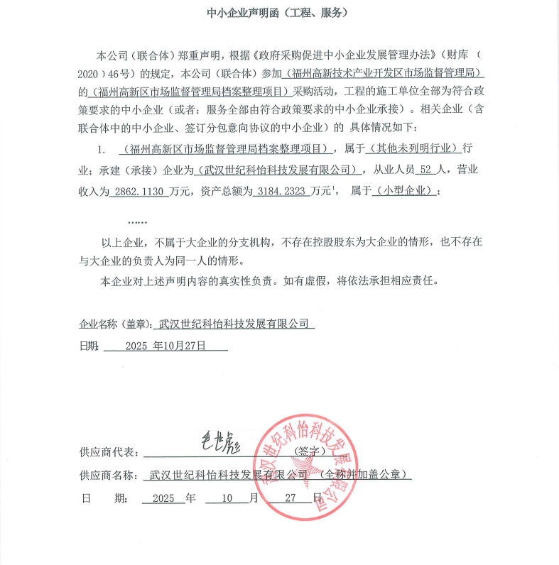 1 | 武汉世纪科怡科技发展有限公司 | 福州高新区市场监督管理局档案整理项目 | 福州高新区市场监督管理局档案整理项目 | 完成福州高新区市场监督管理局档案整理项目 | 2025年12月10日前完成服务并通过验收。 | 按竞争性磋商文件、响应文件、采购合同及国家相关法律法规行业标准规范进行验收。 |